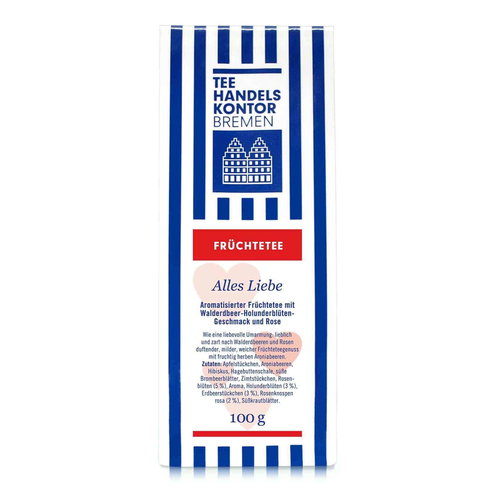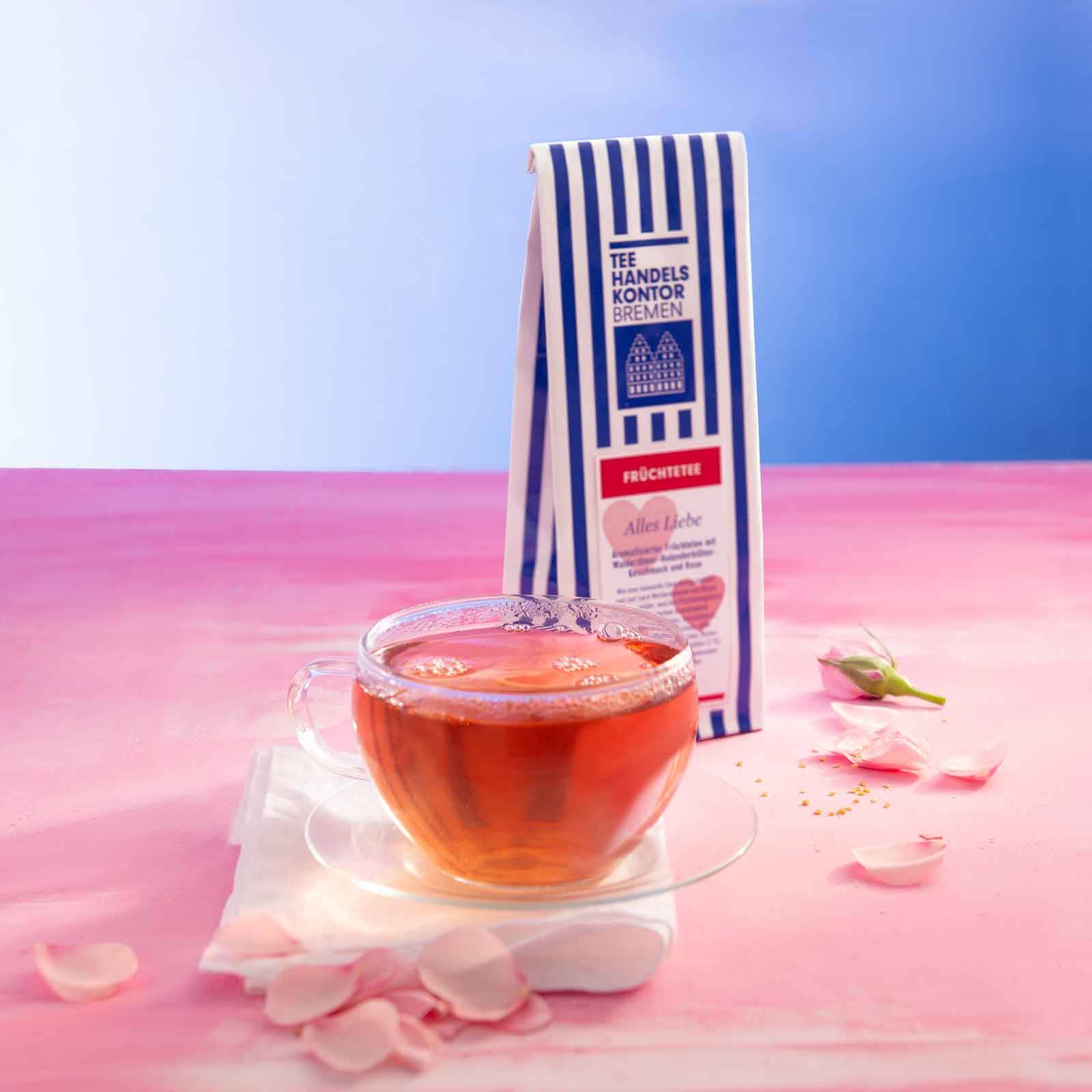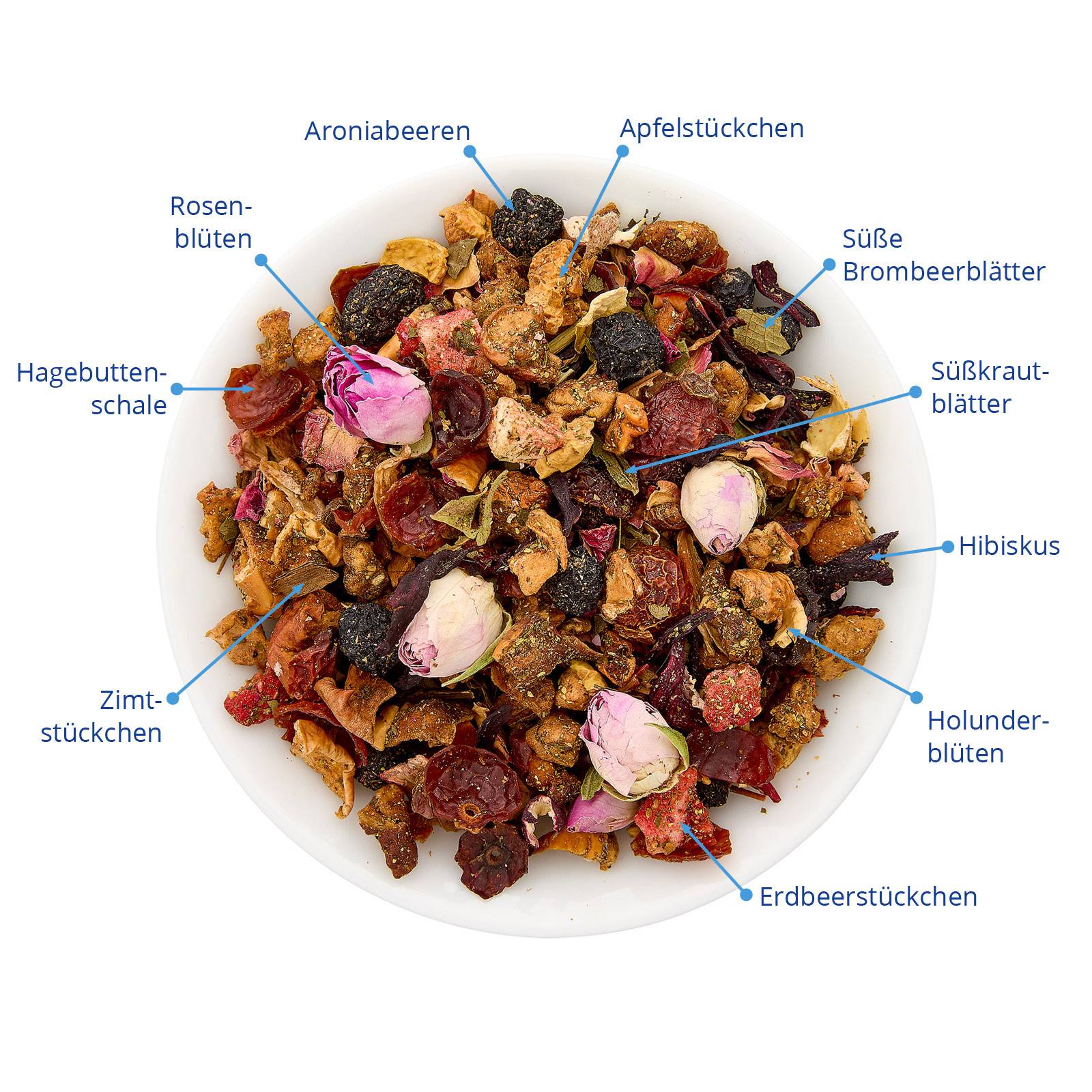Wie eine liebevolle Umarmung: lieblich und zart nach Walderdbeeren und Rosen duftender, milder, weicher Früchteteegenuss mit fruchtig herben Aroniabeeren.