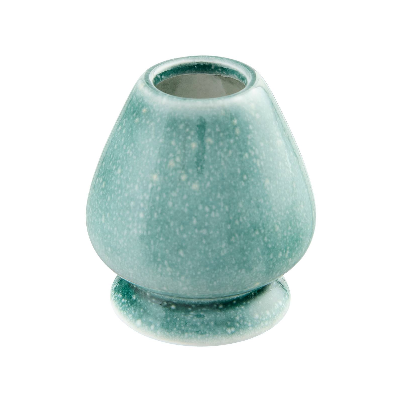 Eleganter Halter für Matcha-Bambusbesen. Gefertigt aus Porzellan mit glatter, leicht glänzender Oberfläche. Die türkise Glasur mit feinen Sprenkeln verleiht dem Stück eine natürliche und zugleich edle Optik. Dank der bauchigen Form bleiben die Borsten des Besens nach dem Gebrauch in Form und trocknen gleichmäßig für eine lange Lebensdauer.
