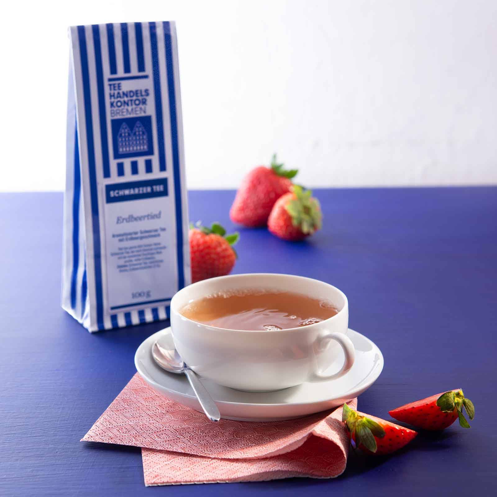 Hat das ganze Jahr Saison: Feiner Schwarzer Tee, der nach Sommer schmeckt – mit der wunderbar fruchtigen Note praller, reifer Erdbeeren.