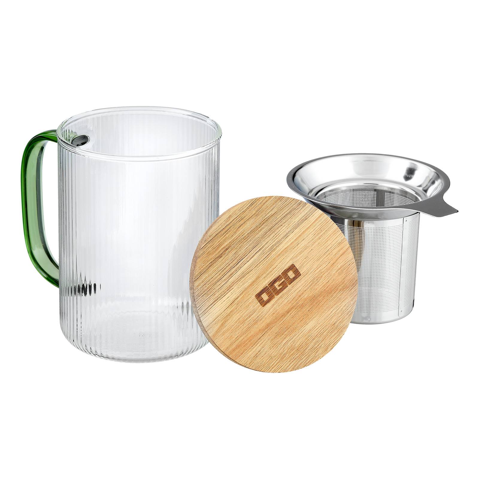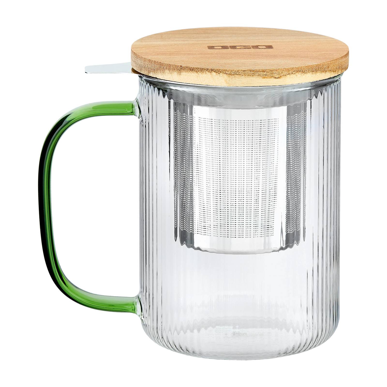 Großer stylischer Teebecher für den großen Teedurst. Auffallend sind das längs geriffelte Glas und ein jadegrüner Glashenkel. Dieser setzt einen frischen Farbakzent und verleiht dem Becher einen besonderen Charme. Durch das geriffelte Glas erhält ihr Tee eine besondere Leuchtkraft. Das mitgelieferte Edelstahlsieb schafft zudem genügend Raum, damit sich die Teeblätter frei entfalten und ihr volles Aroma entwickeln können.
