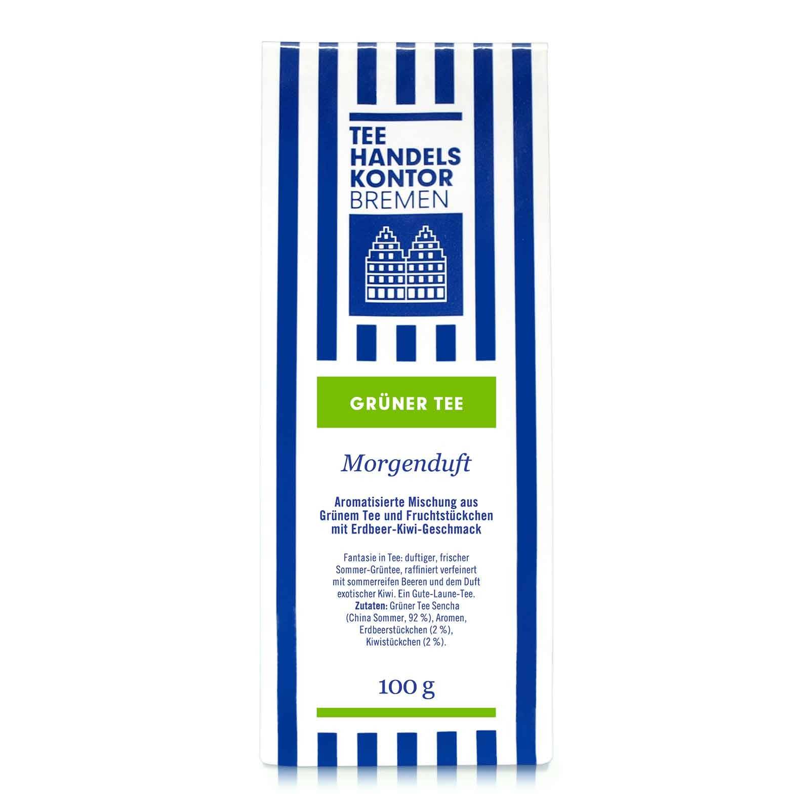 Starte frisch, leicht und gut gelaunt in den Tag: Morgenduft vereint feinen chinesischen Sencha-Grüntee mit dem fruchtigen Geschmack sonnengereifter Erdbeeren und exotischer Kiwi. Ein aromatisierter Grüntee, der wie ein Morgenspaziergang durch den Sommergarten schmeckt.