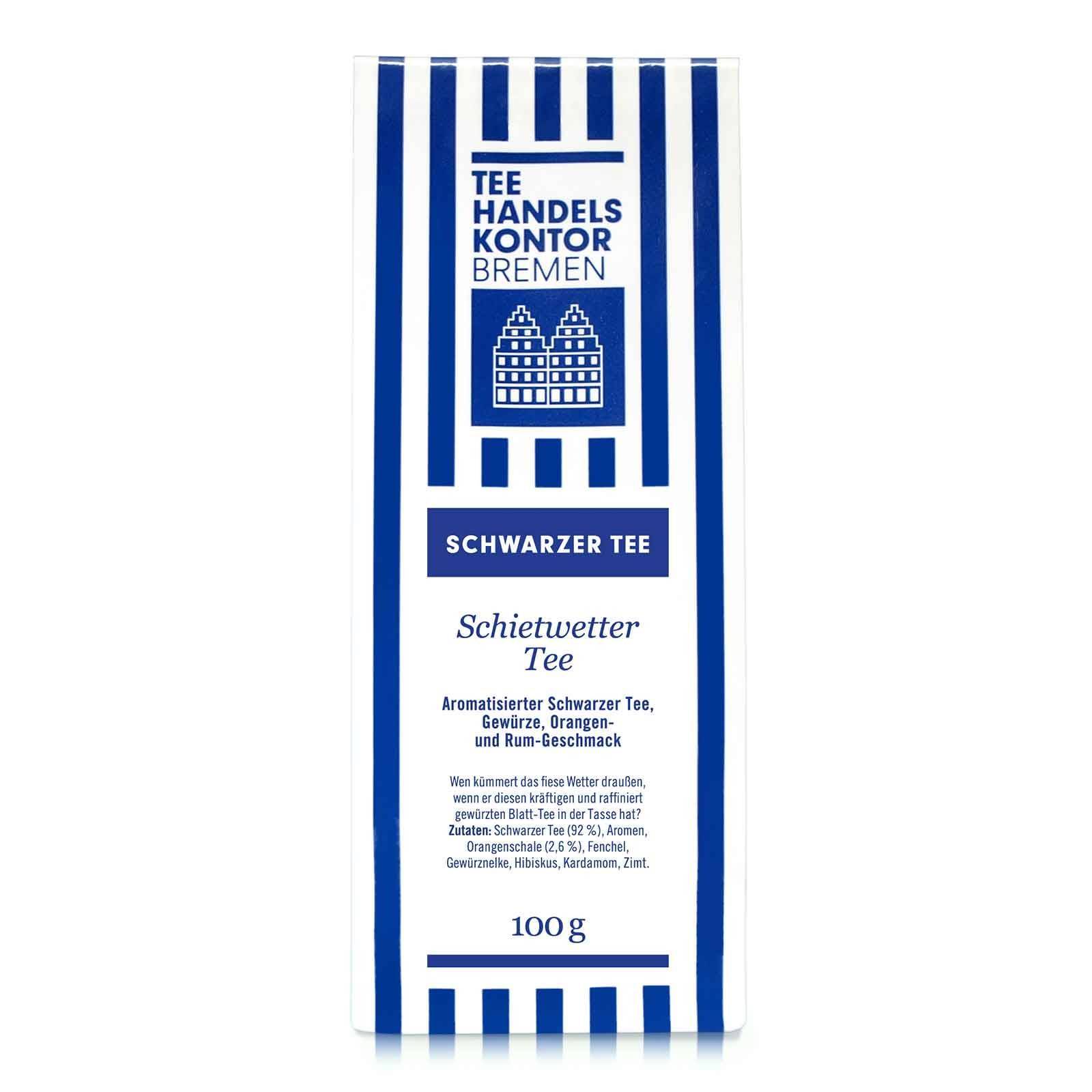 Der Schietwetter Tee vom Tee-Handels-Kontor Bremen ist eine Einladung, den grauen Himmel einfach zu vergessen. Seine kräftige Schwarztee-Basis verbindet sich harmonisch mit feinen Gewürzen und fruchtigen Orangen-Noten, die durch einen Hauch Rum-Aroma abgerundet werden.