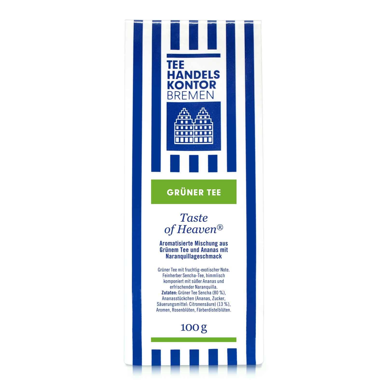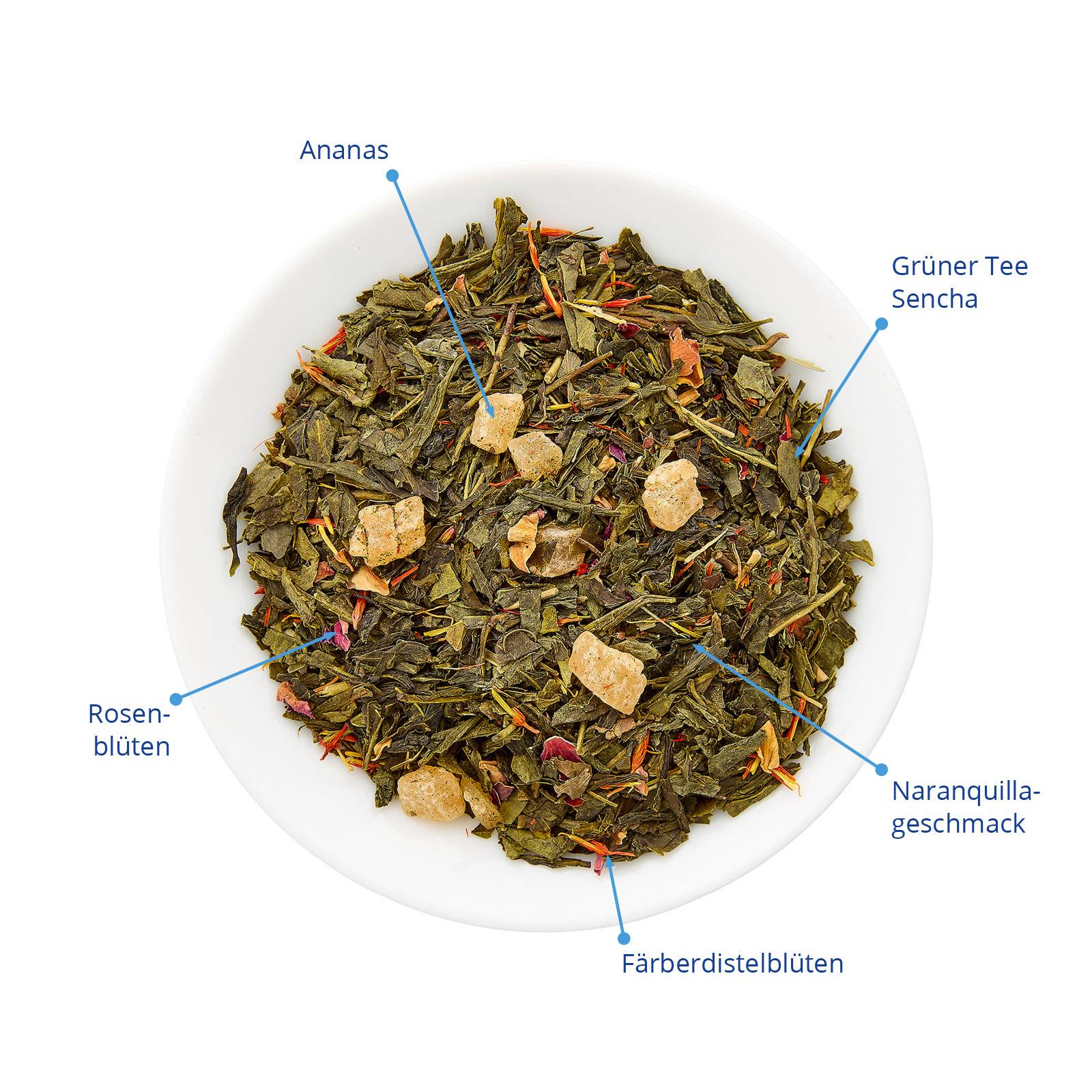 Grüner Tee mit fruchtig-exotischer Note. Feinherber Sencha-Tee, himmlisch komponiert mit süßer Ananas und erfrischender Naranquilla.