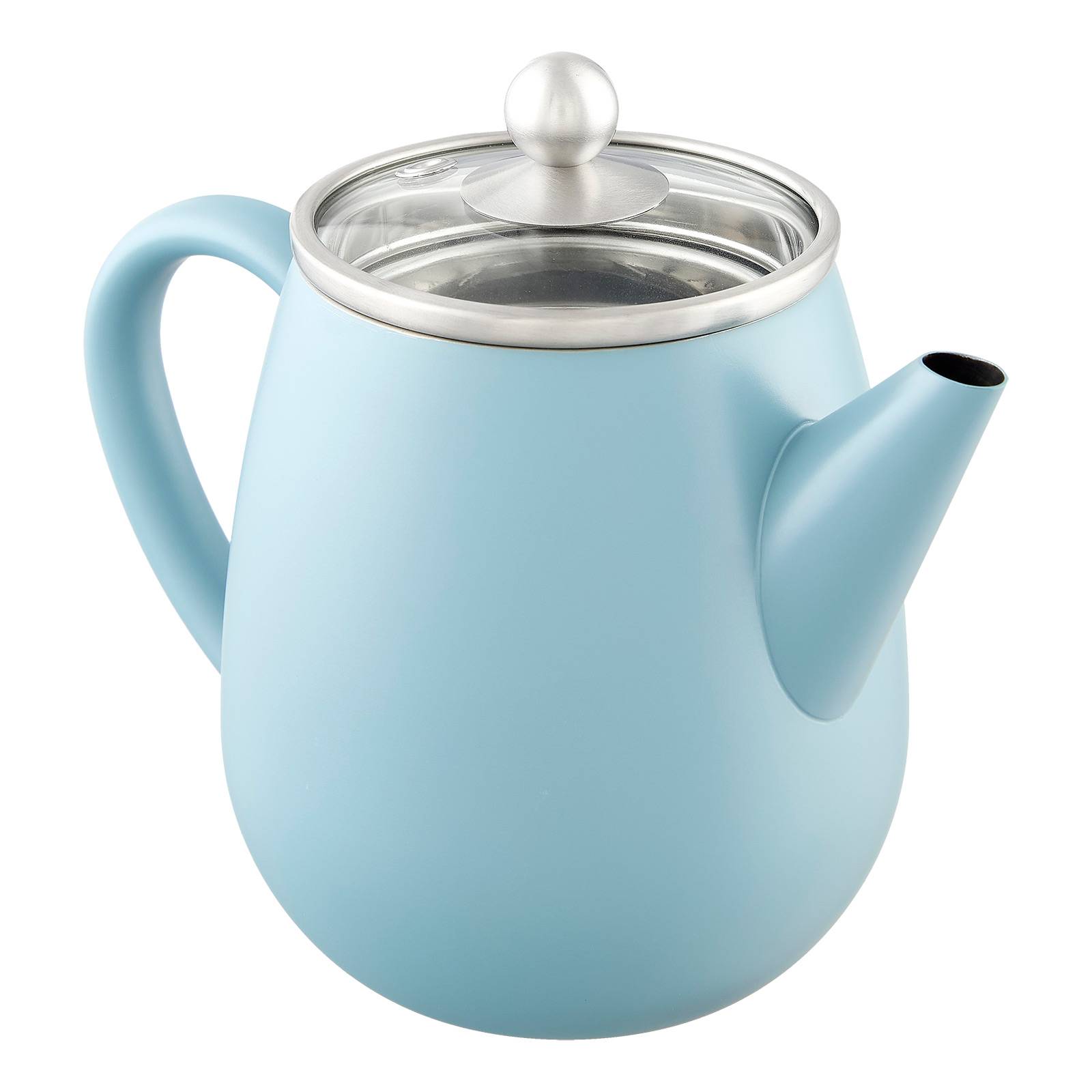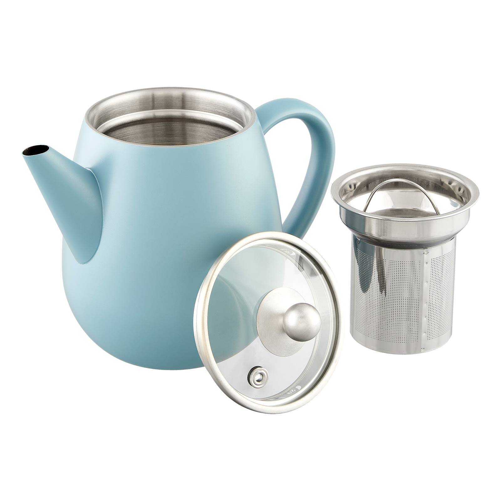 Teekanne in sanftem Eisblau mit modernem Design und matter, samtiger Oberfläche. Der Glasdeckel mit Edelstahlrand sitzt fest und ermöglicht bequemes Ausgießen mit einer Hand. Die doppelwandige Isolierung hält den Tee etwa 45 Minuten lang heiß. Das einzigartige Tüllendesign sorgt dafür, dass die Kanne beim Einschenken nicht tropft. Griff und Deckelknopf bleiben maximal handwarm. Das geräumige, feinmaschige Edelstahlsieb bietet ausreichend Platz für Teeblätter, damit sich Aroma und Geschmack optimal entfalten.