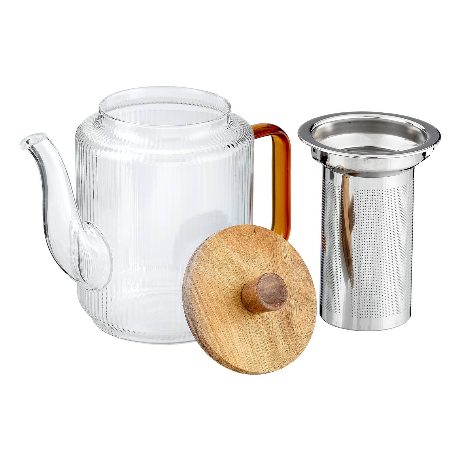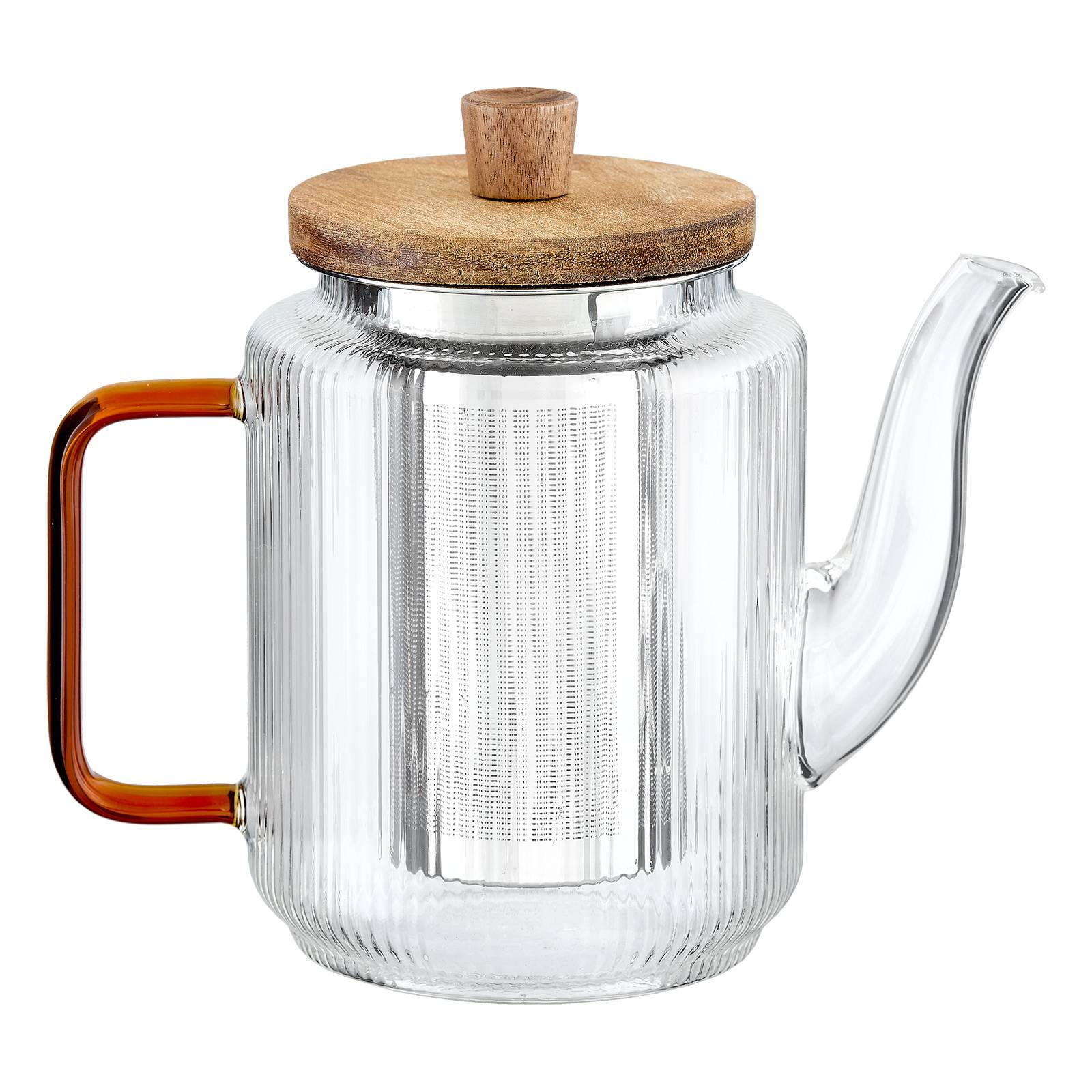 Diese Glasteekanne überzeugt durch ihre zylindrische Form, die geschwungene Schnaupe, den markanten Holzdeckel und den geradlinigen, auffallend großen, bernsteinfarbenen Glashenkel. Durch das längs geriffelte Borosilikatglas schillert der Tee appetitlich in der Kanne. In dem geräumigen Edelstahlsieb haben Teeblätter viel Platz, um ihr Aroma optimal zu entfalten.