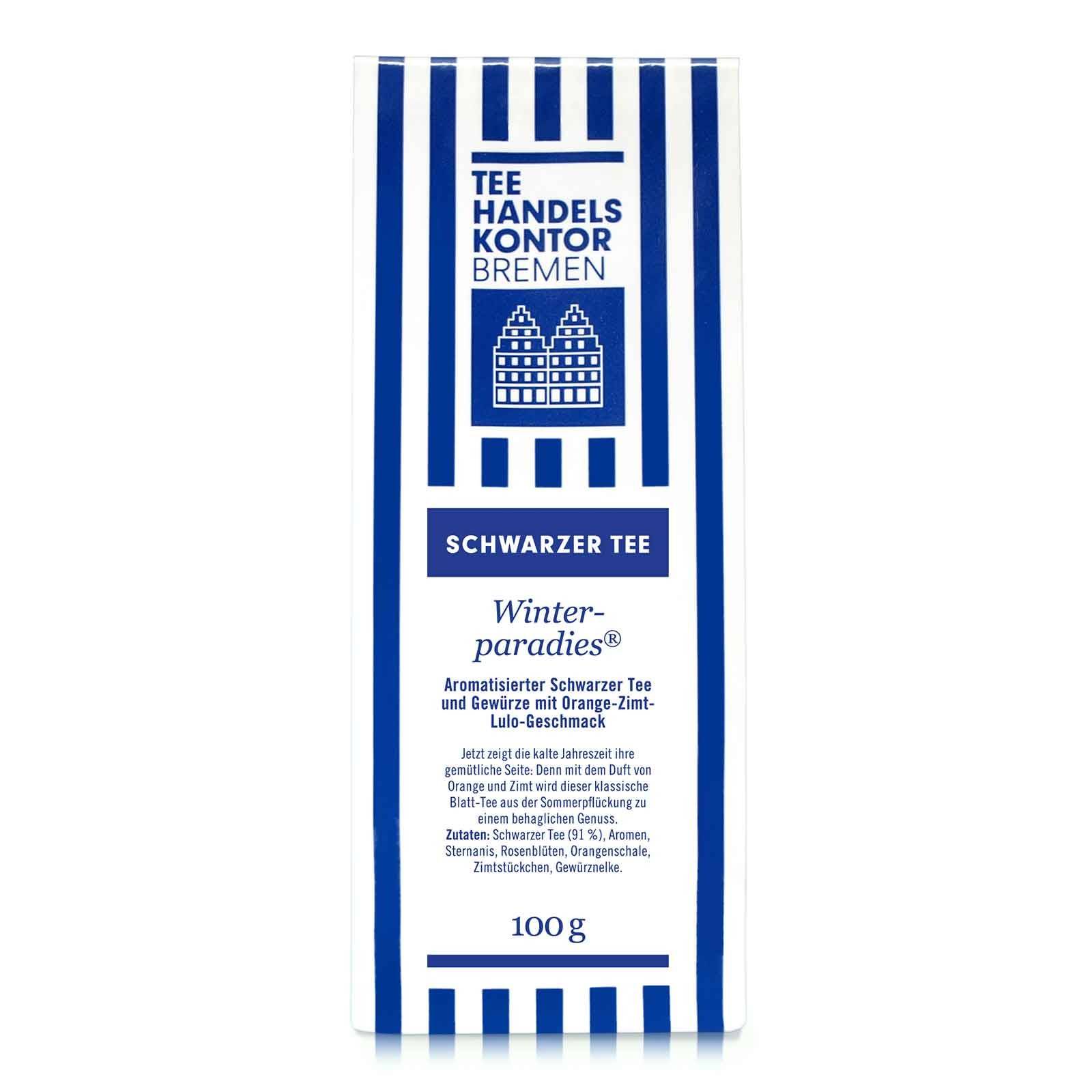 Der Tee Winterparadies® vom Tee-Handels-Kontor Bremen bringt die Magie des Winters direkt in deine Teetasse. Die kräftige Schwarztee-Basis vereint sich mit winterlichen Gewürzen zu einem aromatisch-fruchtigen Geschmackserlebnis, das jeden Schluck zu einem Wohlfühlmoment macht.